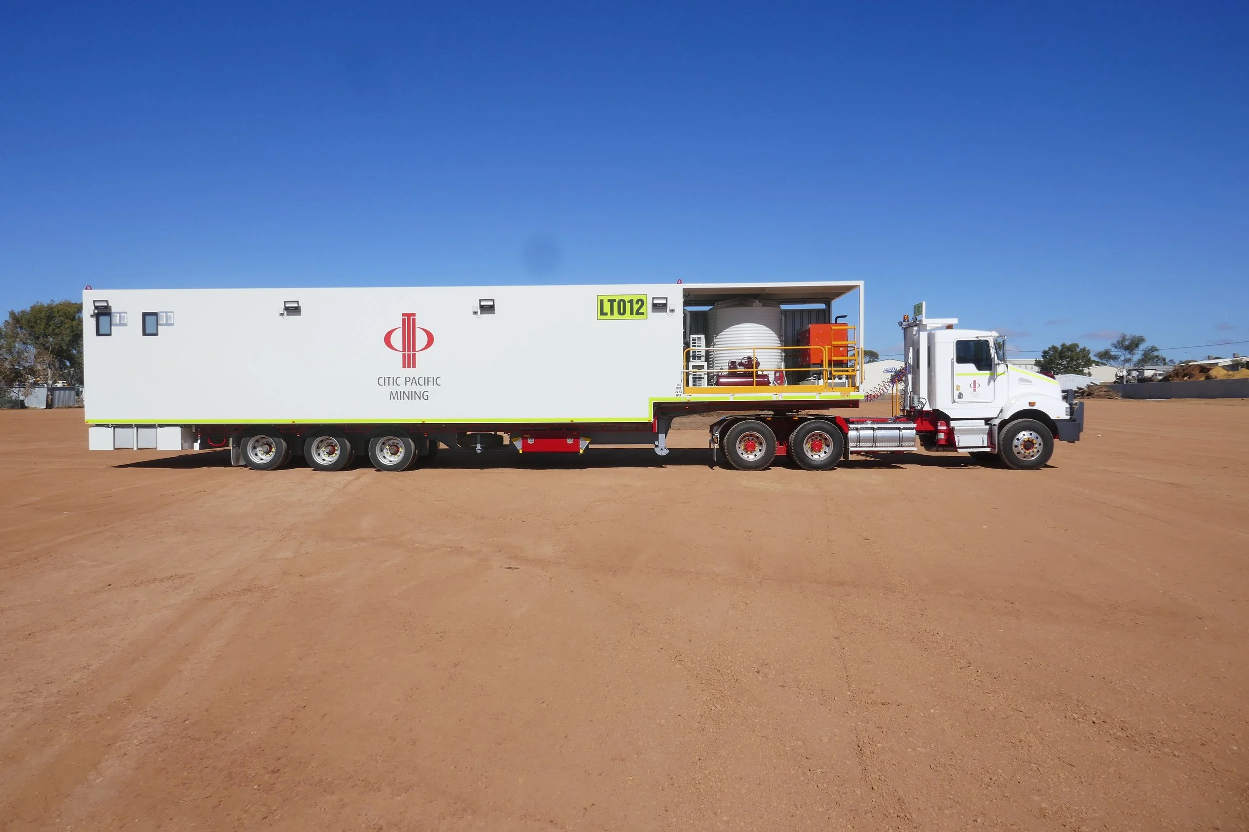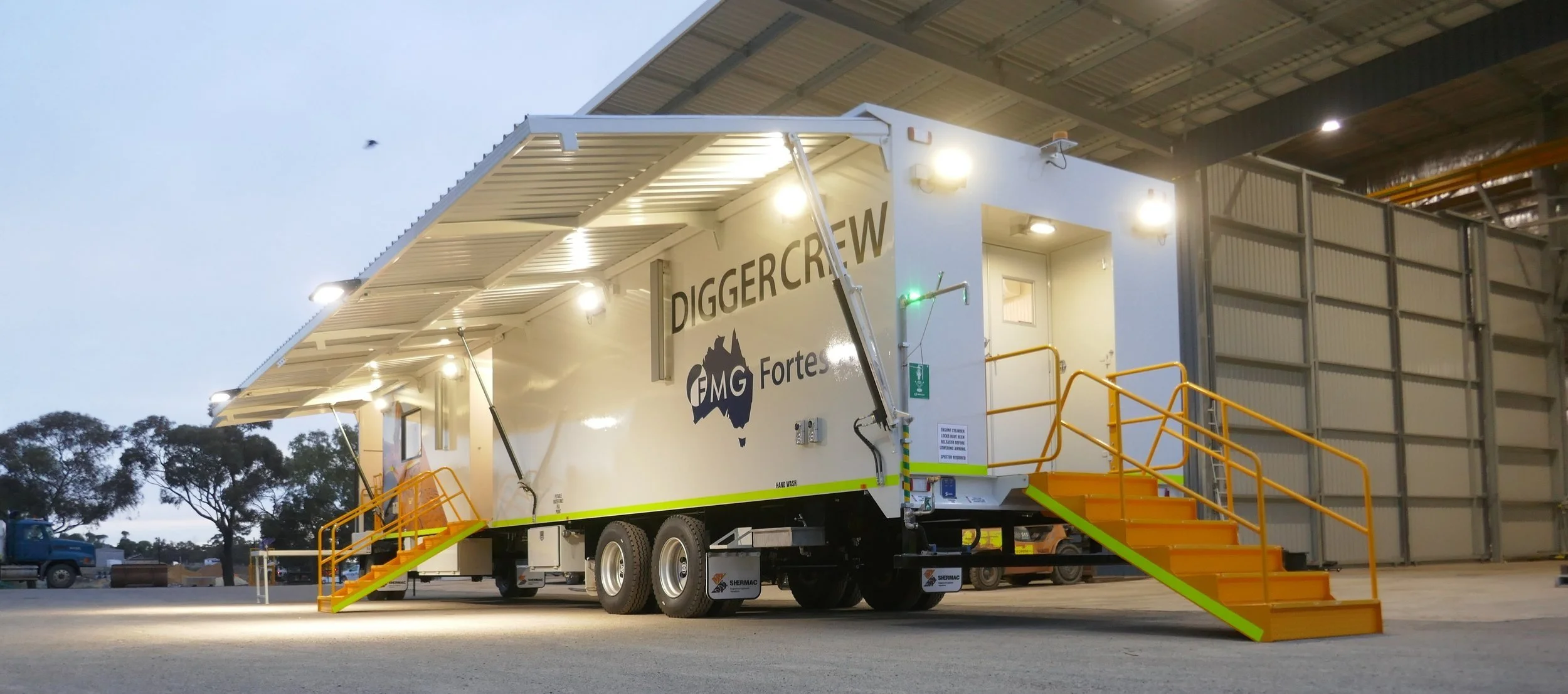 The heavy-duty tandem axle trailer is built for rugged site conditions, featuring steel sandwich panel walls and roof for superior strength, insulation, and durability. A mini-rib cladded awning provides added weather protection at the entry point, ensuring safe use in all conditions. Measuring approximately 12 metres long, 2.5 metres wide, and 3.8 metres high, the trailer offers ample space to house both a fully equipped workshop and a comfortable mess room. At the rear, hydraulic fold-down stairs allow for safe and easy access, even in high-traffic environments.
